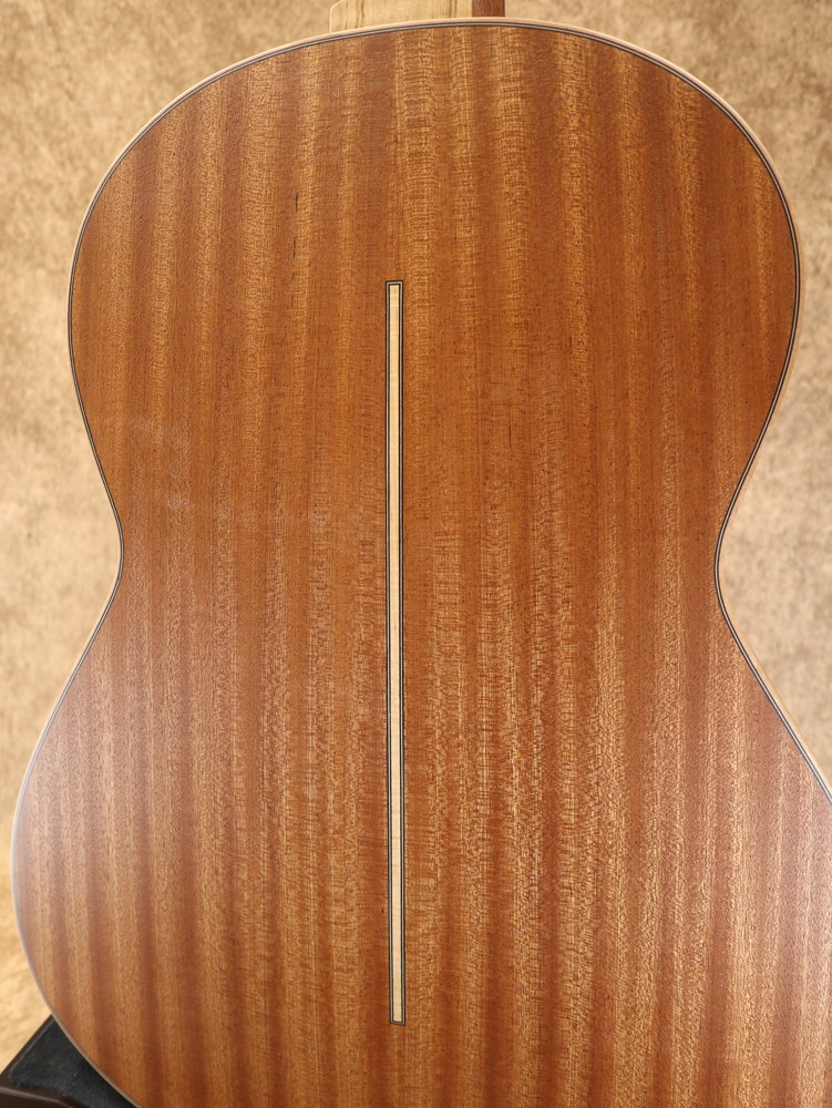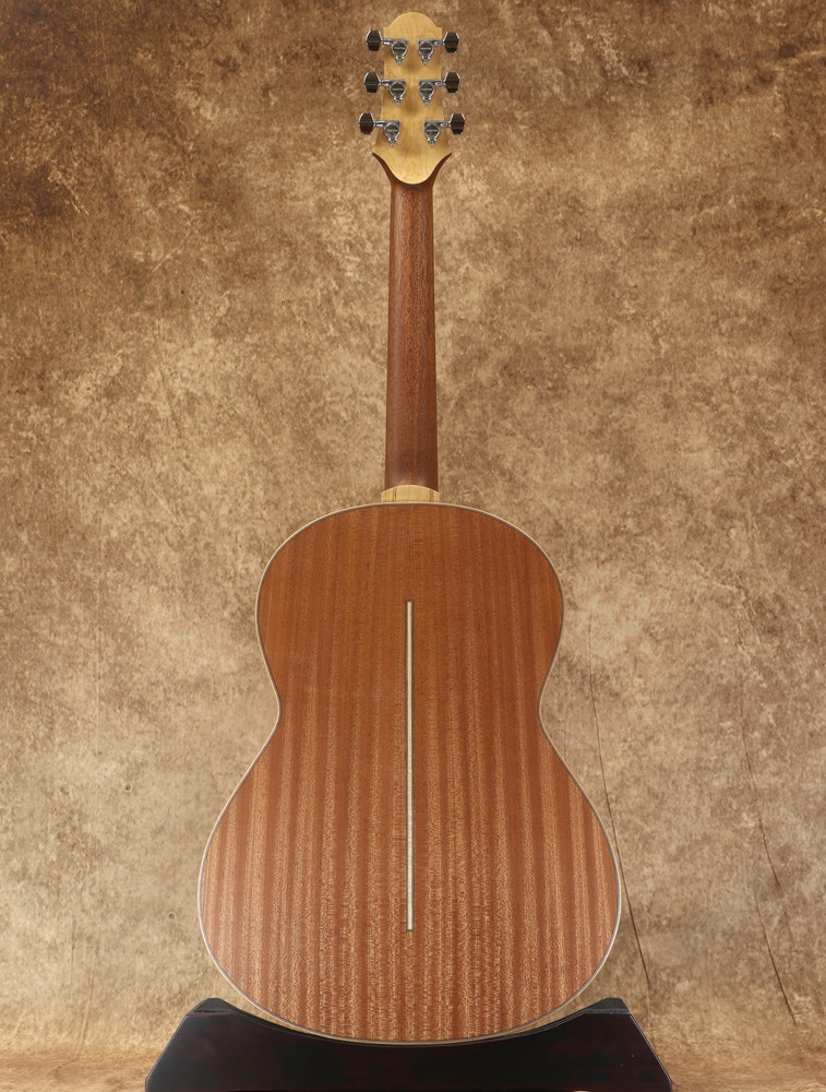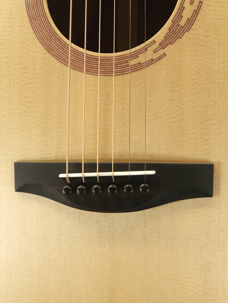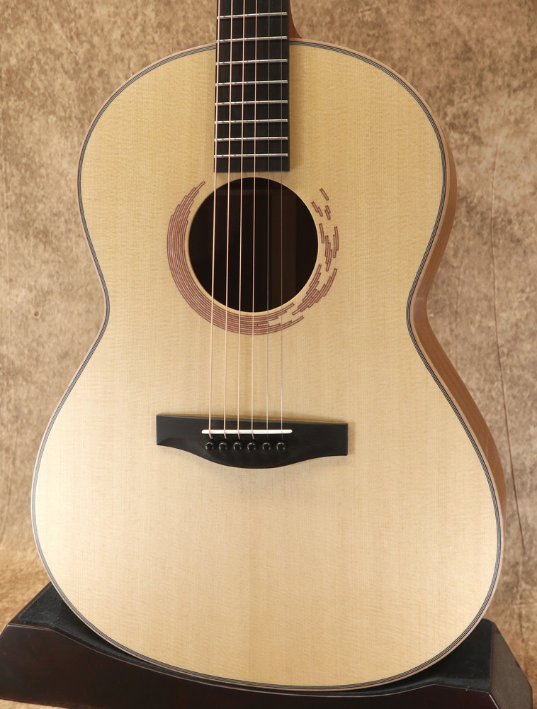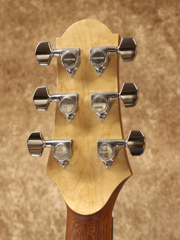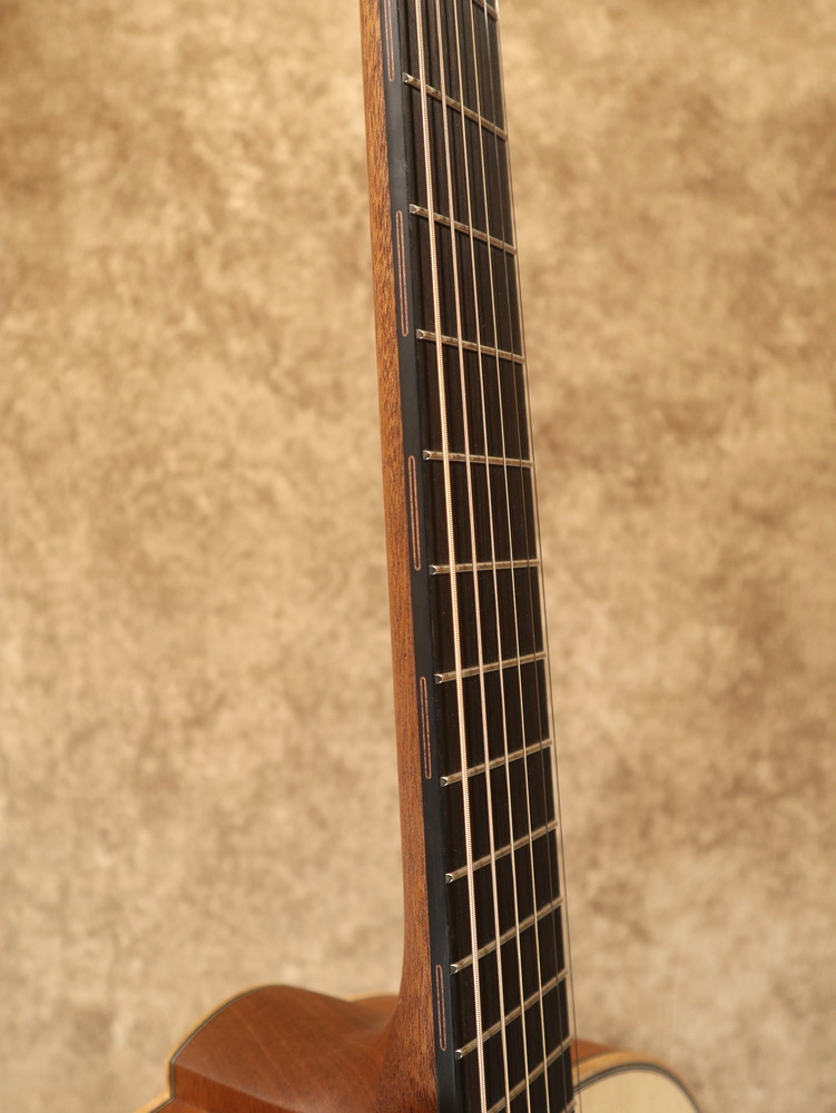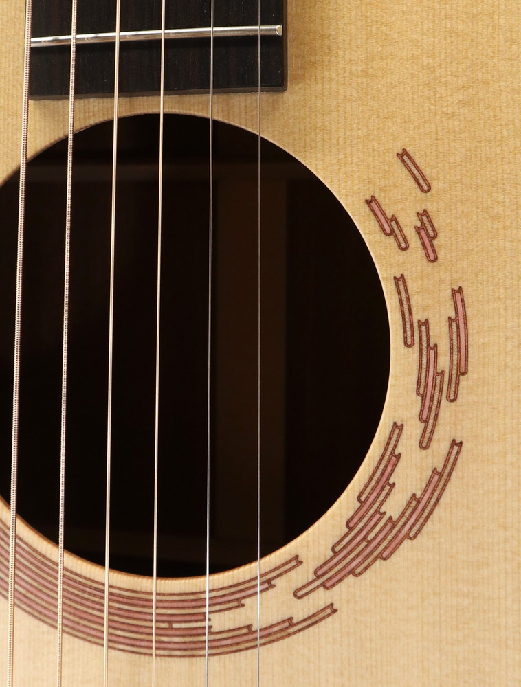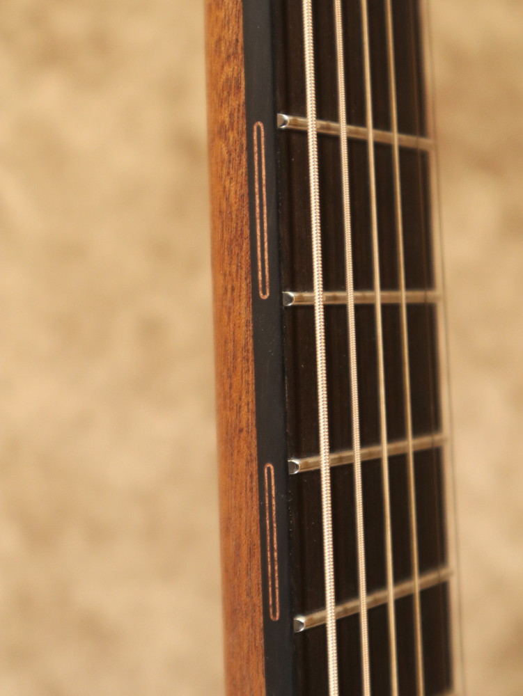表面板は弦の振動をボディ端まで届かせるようなイメージで製作されており、ボディ中央を鳴らし過ぎないことによりスチール弦のエネルギーをストレートに感じられる魅力があります。