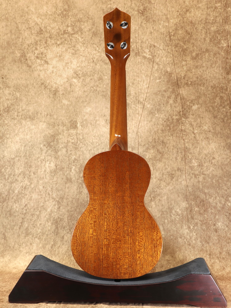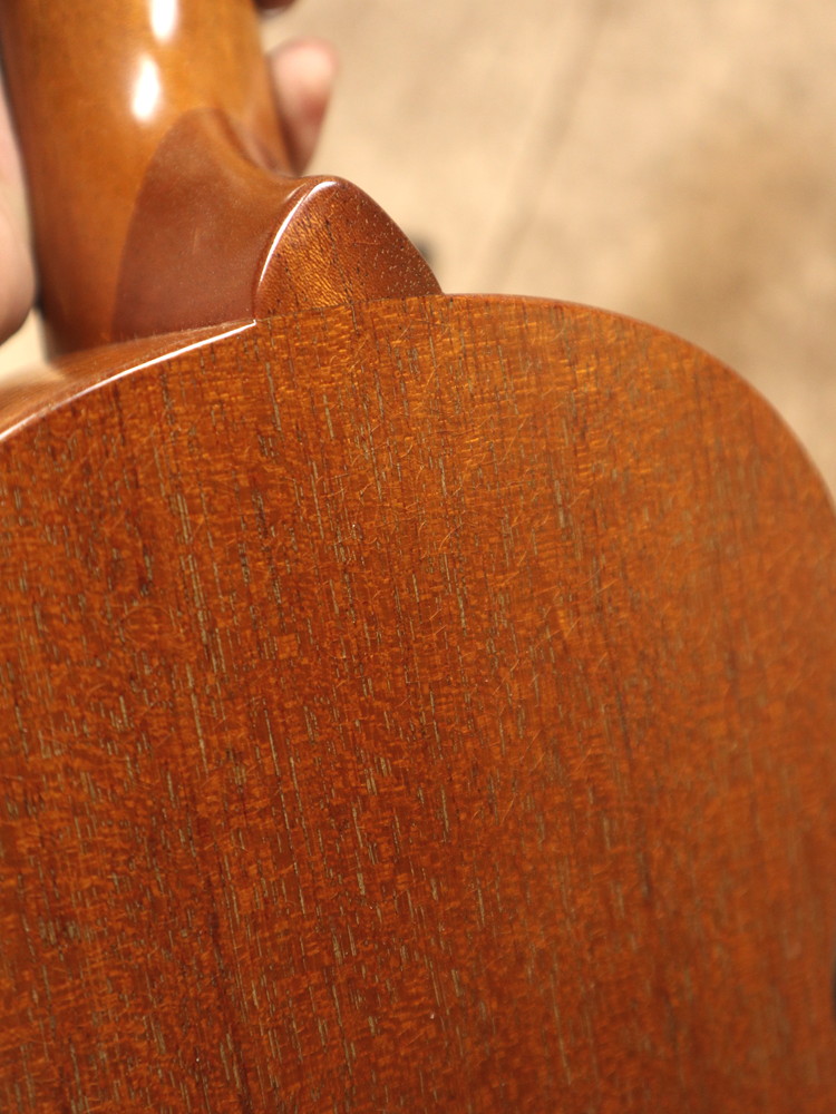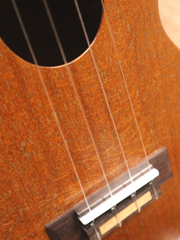 塗装はオプション扱いのウクレレラッカー仕上げで薄く仕上げており、程よいツヤ感のある仕上がりです。気温の変化によるクラックが入っていますが、新品でありながらヴィンテージのような雰囲気を携えています。