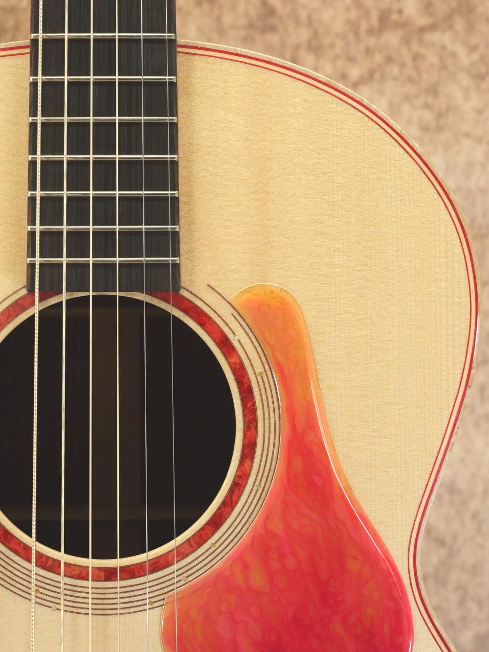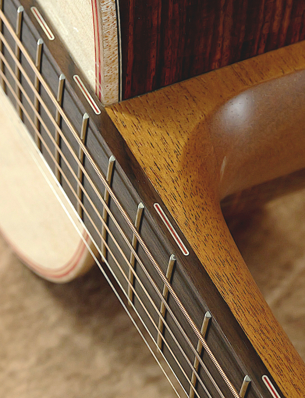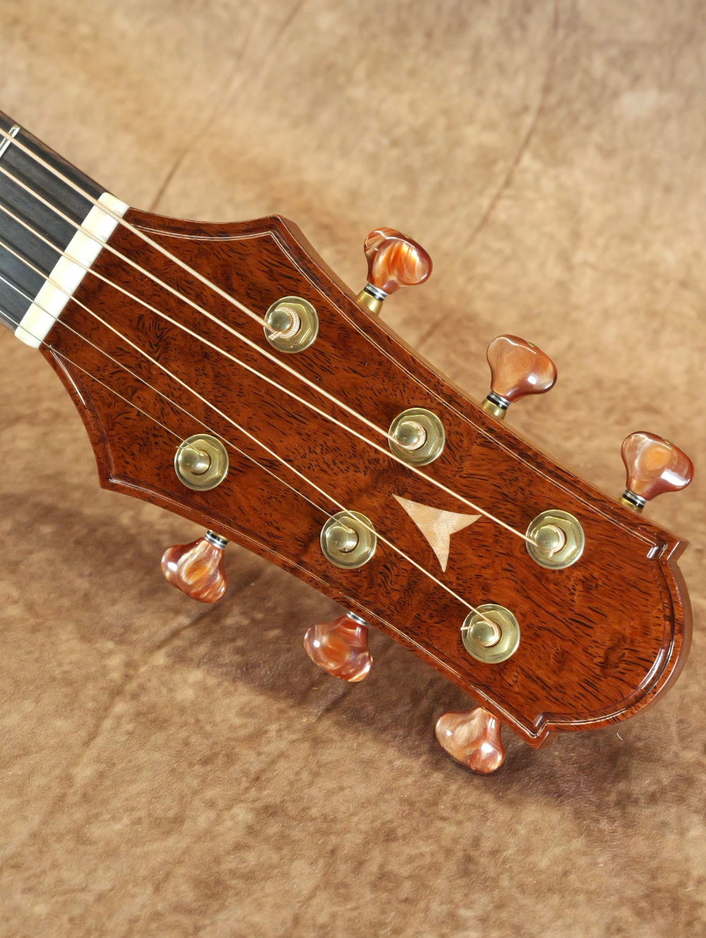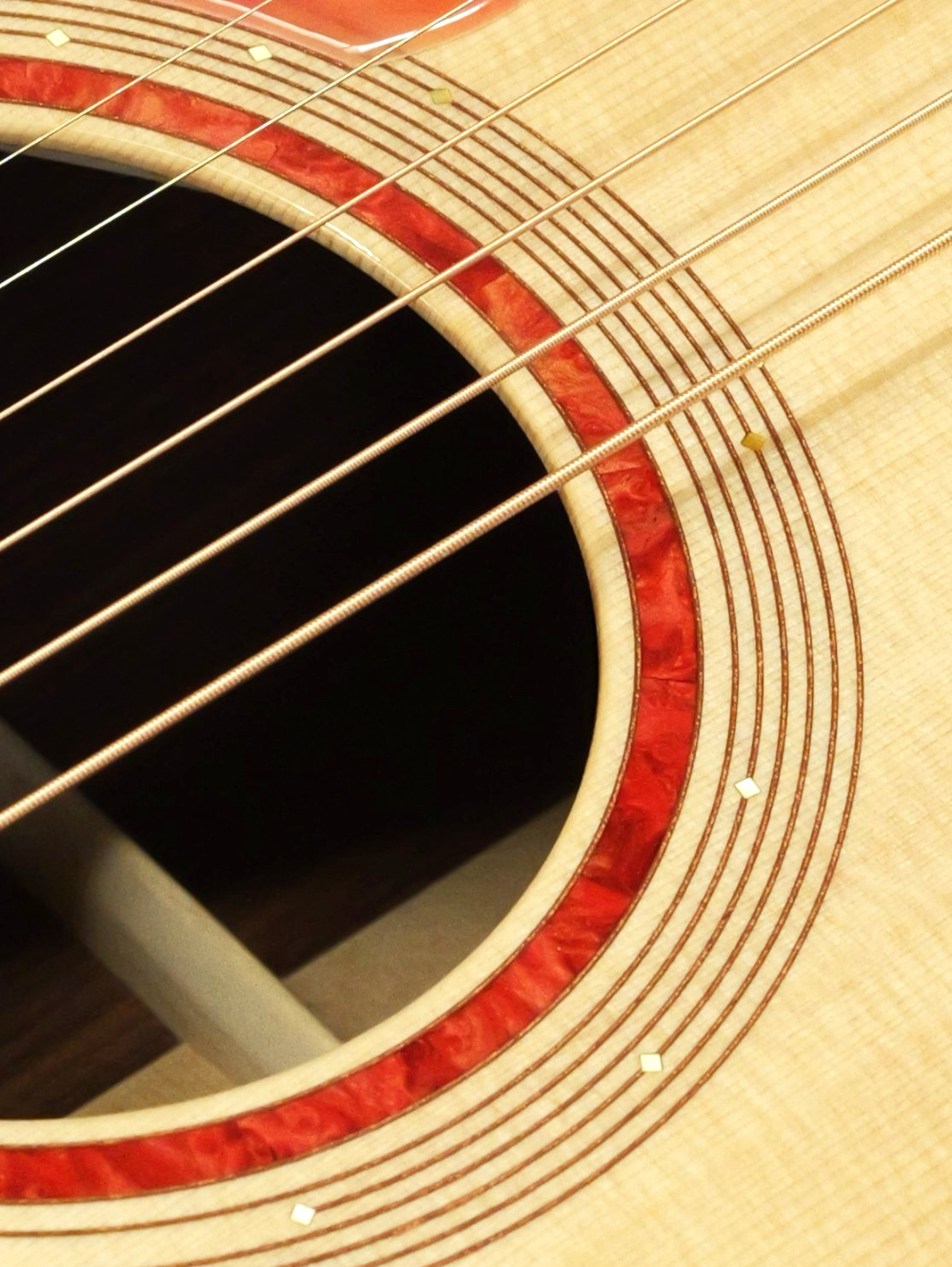 指板サイドのポジションマークやサウンドホールの装飾には黄蝶貝を使用。金細工のような輝き方をしながらも奥行きのある穏やかさが印象的です。