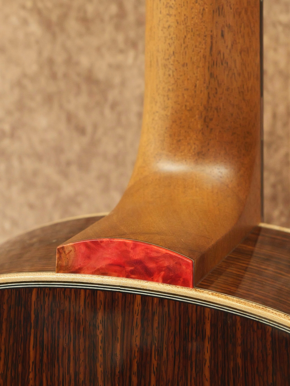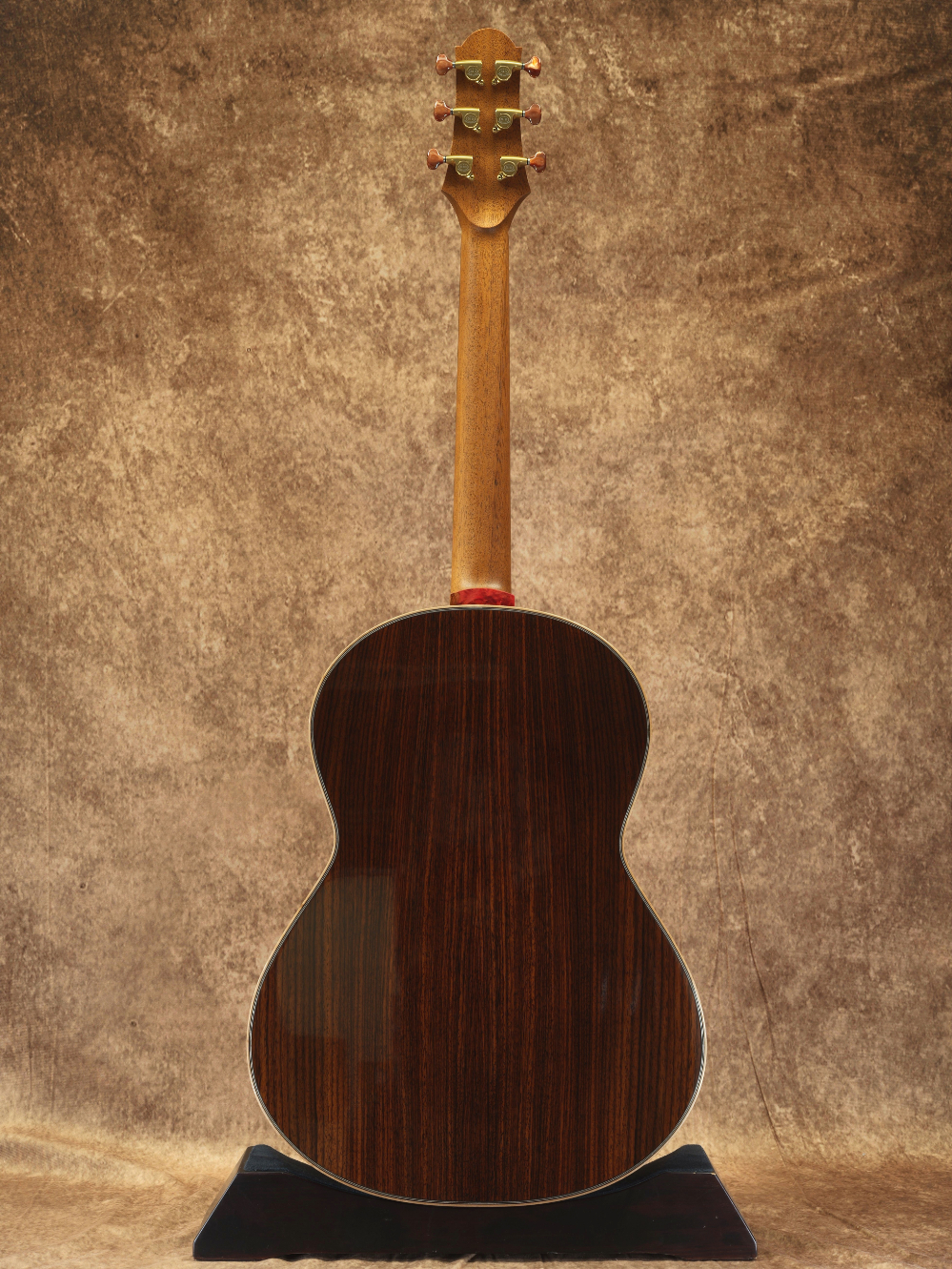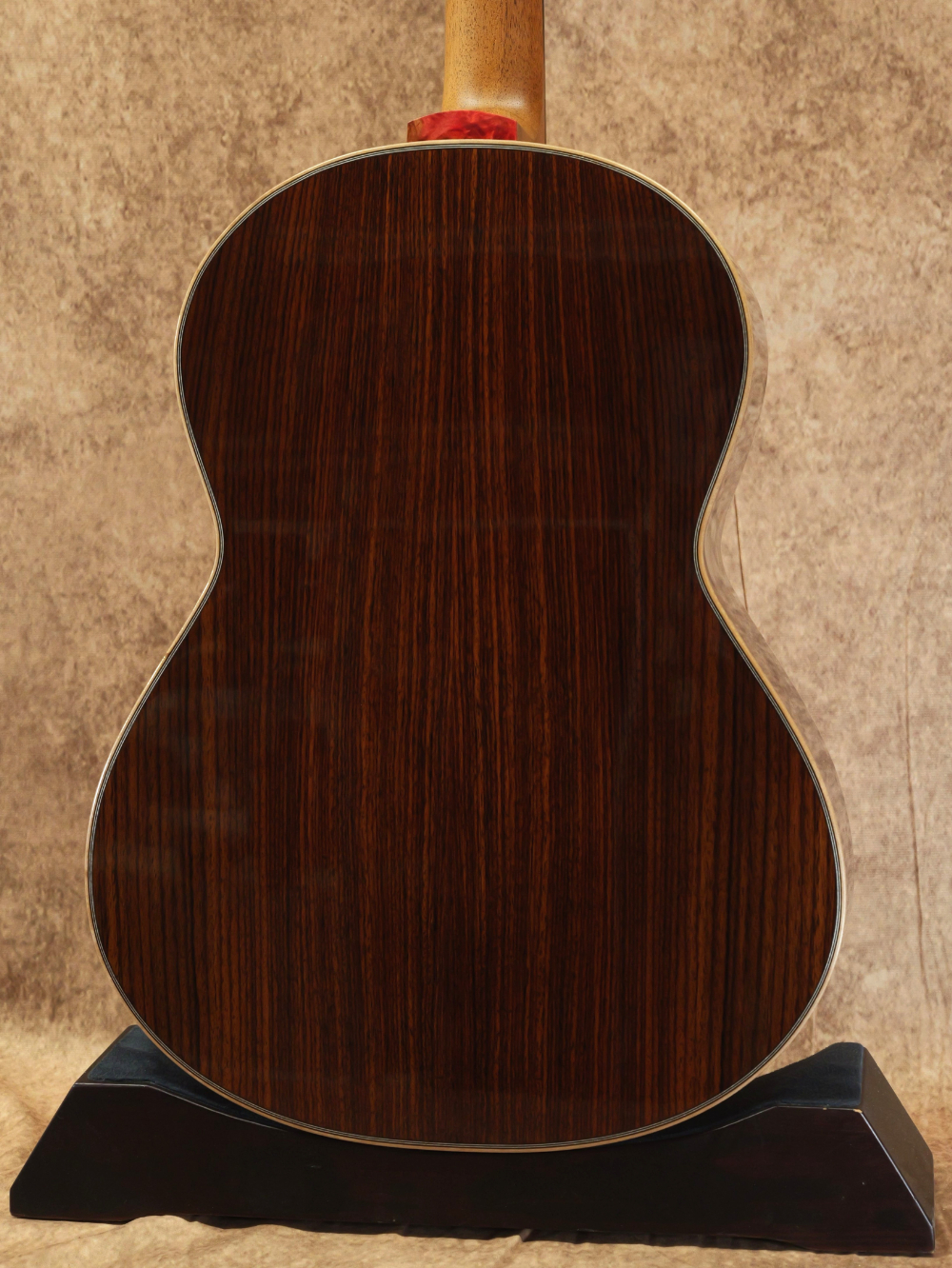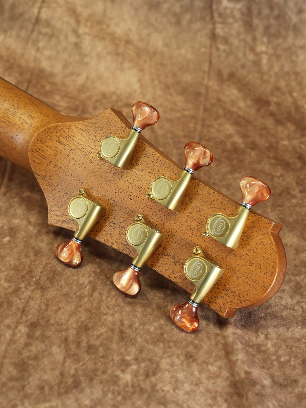 指板サイドのポジションマークやサウンドホールの装飾には黄蝶貝を使用。金細工のような輝き方をしながらも奥行きのある穏やかさが印象的です。